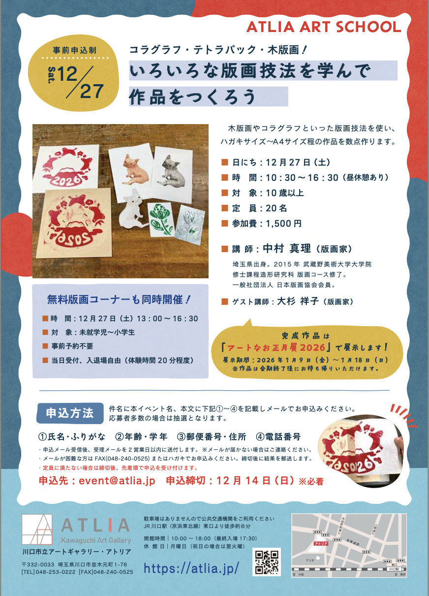 川口市立アートギャラリー・アトリアで版画で年賀状をつくるワークショップのこ講師をさせていただきます。